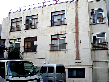 窓枠も手すりも錆びて、壁は錆びが流れて、